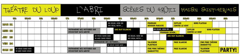 L’émoi des premières fois ! Maquettes, coups d’essai, premiers et deuxièmes projets, spectacles de fin d’études... Le festival C’EST DÉJÀ DEMAIN a pour vocation de présenter au public les nouveaux·elles créateur·ice·x·s de la scène romande. Tant plateforme d’échange que fenêtre ouverte sur les talents émergents de la région, ce festival offre à tout un chacun l’opportunité de découvrir la diversité d’une nouvelle scène contemporaine. Pour cette 14e édition, la Maison Saint-Gervais, le Théâtre du Loup, L’Abri et les Scènes du Grütli font à nouveau front commun afin de concocter un programme dense, éclectique et prometteur.