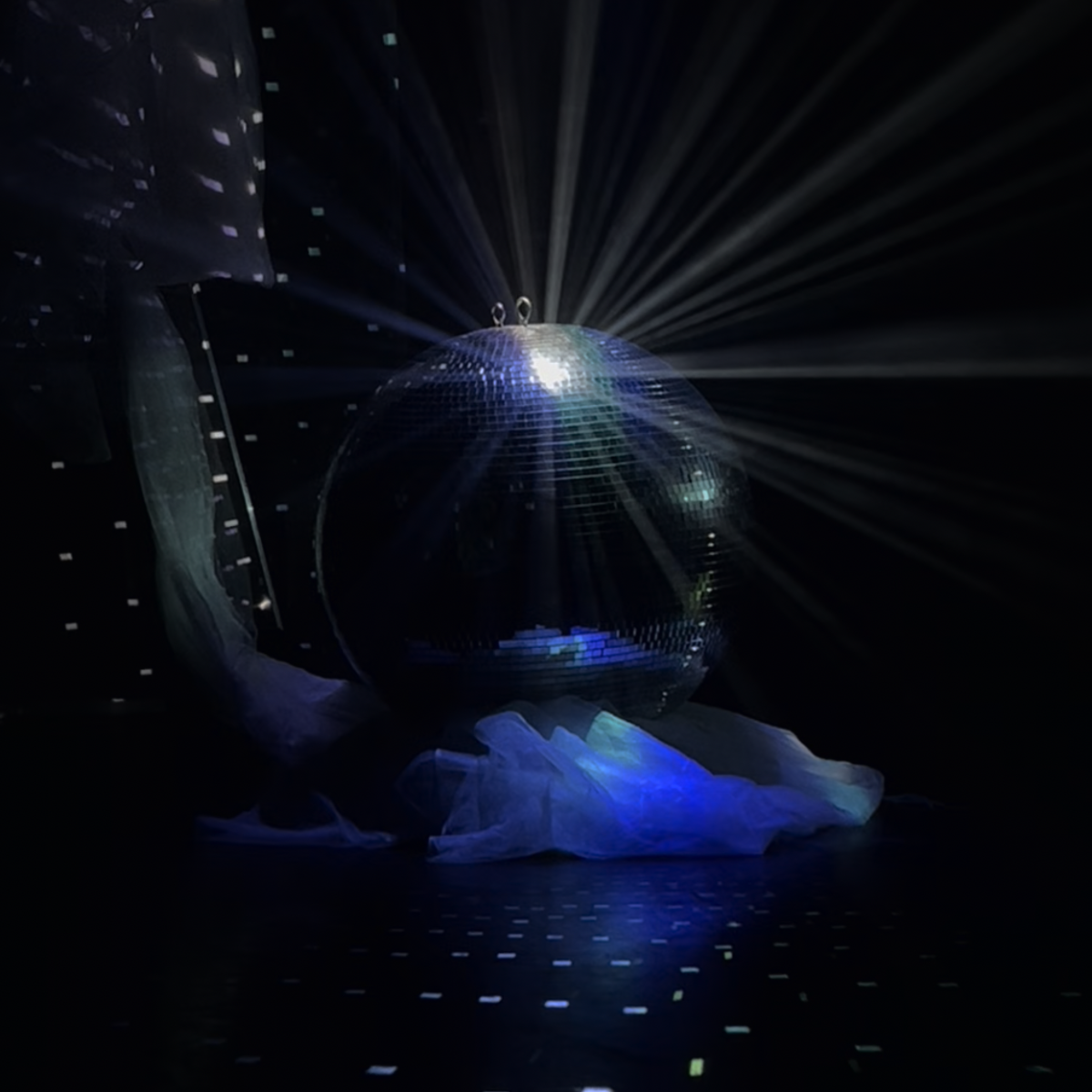 Résultat, sa sortie de résidence est un voyage au sein du vaisseaux SCARLETMOTIFF. Une installation audiovisuelle qui retrace son périple à travers des images clés et des paysages sonores récoltés au fil de ses explorations. Inspiré par l’esthétique des films de science-fiction des années 80 et 90, le dispositif invite à déambuler dans un labyrinthe de projections. Ces dernières compilent affiches et visuels glanés durant ses trois mois en Suisse, rendant hommage à sa riche culture visuelle. Au centre de la salle, une immense boule à facettes diffuse des éclats lumineux vers une constellation de miroirs répartis dans l’espace. Ce jeu de réflexions guide les visiteur·euse·x·s, les incitant à explorer physiquement et sensoriellement l’installation.