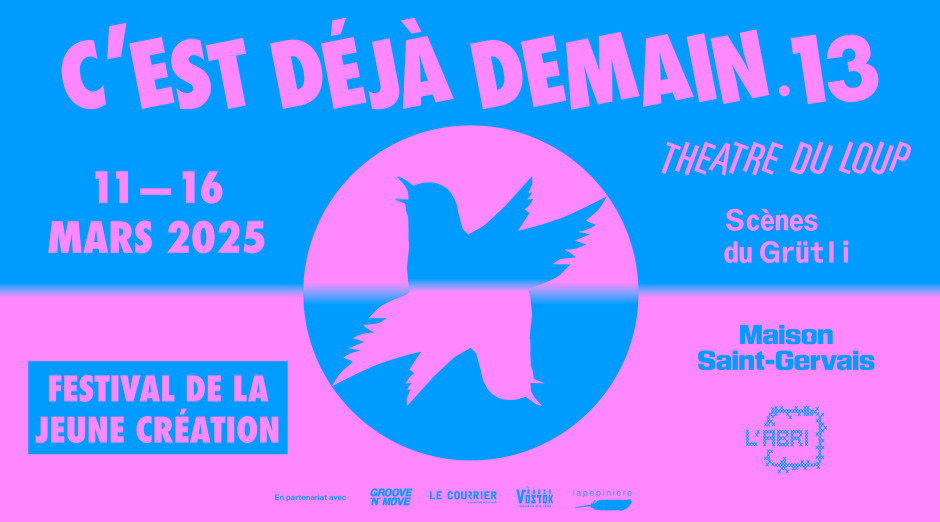 Le Théâtre du Loup, la Maison Saint-Gervais, L’Abri – Genève et les Scènes du Grütli font à nouveau front commun en 2025 afin de vous concocter un programme dense, éclectique et prometteur pour cette 13e édition du festival de la jeune création. Avec en prime cette année, une collaboration spéciale avec le Groove’N’Move Festival !